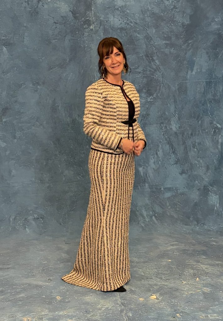 El conjunto está compuesto por una falda larga entallada con corte sirena y cola, acompañada de una chaqueta de corte Chanel, ambas piezas confeccionadas en tejido de lentejuelas en tonos beige y negro. La chaqueta destaca por su acabado elegante y su cosido artesanal, reflejando el cuidado en cada detalle que caracteriza al trabajo del Equipo de Moda de la entidad.